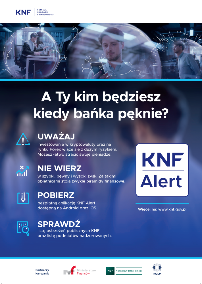 Komisja Nadzoru Finansowego prowadzi kampanię ,,A ty kim będziesz kiedy bańka pęknie?” Celem akcji jest zwrócenie uwagi społeczeństwa na ryzyko związane z inwestowaniem w kryptowaluty oraz na rynku Forex. Partnerami akcji jest Policja, Ministerstwo Finansów oraz Narodowy Bank Polski.