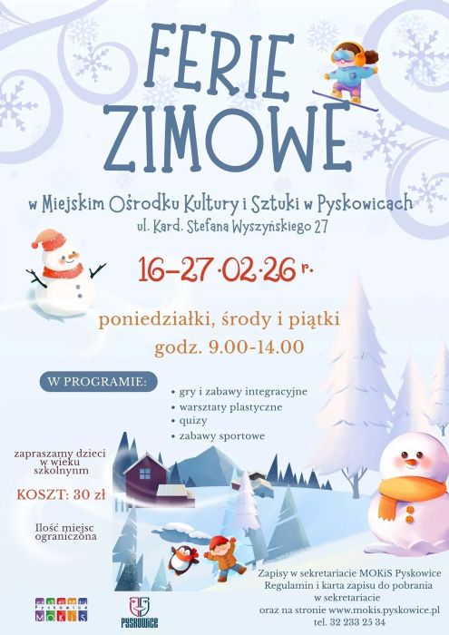 Ferie zimowe w Pyskowicach zbliżają się wielkimi krokami, a MOKiS Pyskowice przygotował dla dzieci bogaty program zajęć i wyjazdów edukacyjno-rekreacyjnych. Warto wcześniej zaplanować udział, bo liczba miejsc jest ograniczona.
