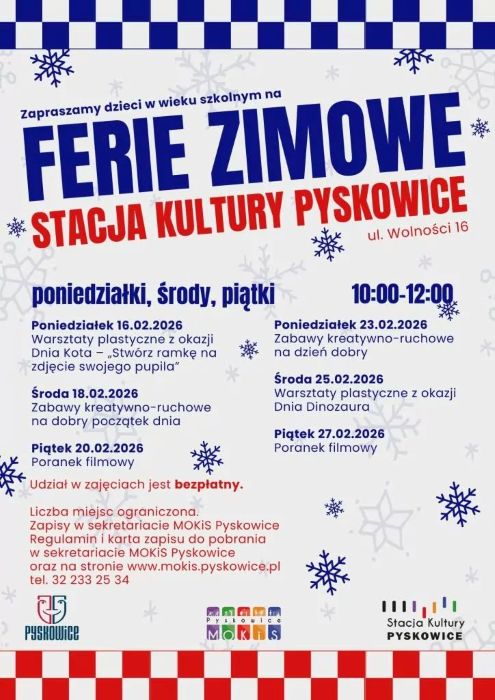 MOKiS Pyskowice przygotował ferie 2026 dla dzieci: warsztaty stacjonarne i wyjazdy do Gliwic, Zabrza i Katowic. Liczba miejsc ograniczona, obowiązują zapisy – warto się szybko zgłosić.