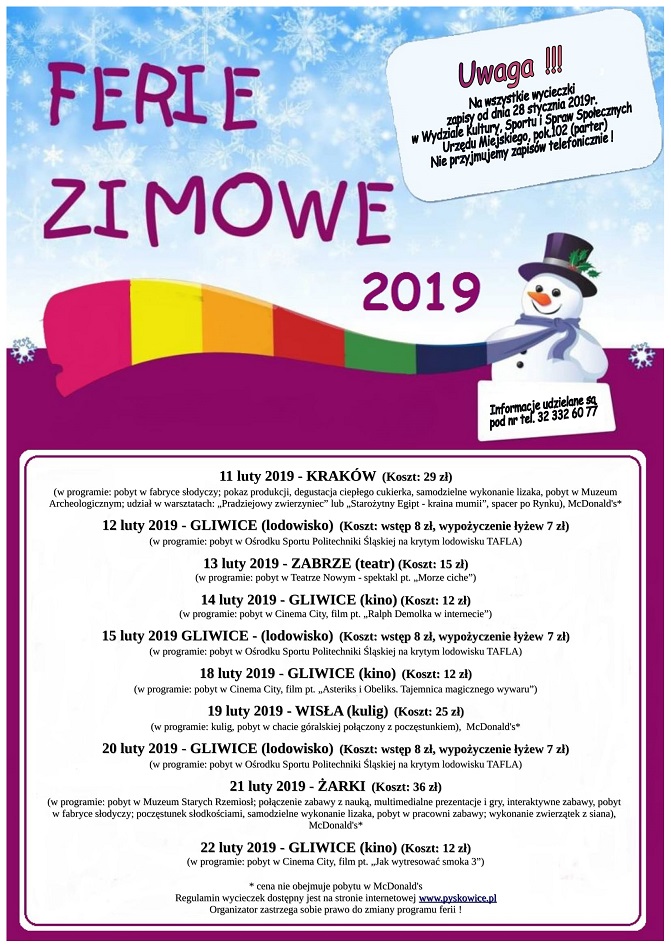 Programy i regulaminy wycieczek dostępne są na stronie internetowej https://www.pyskowice.pl/co-gdzie-kiedy/ferie-w-miescie.html oraz na załączonym plakacie