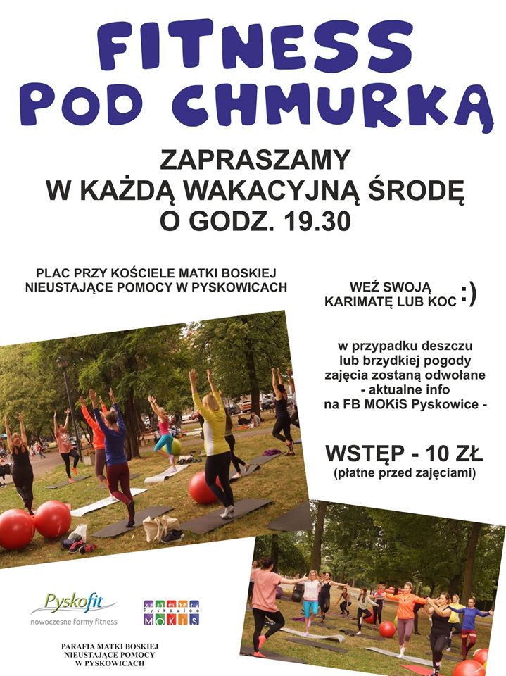Dlatego też MOKiS Pyskowice razem z Pyskofit oraz Parafia MBNP w Pyskowicach zapraszają w każdą wakacyjną środę o godz. 19.30 na Fitness pod chmurką.