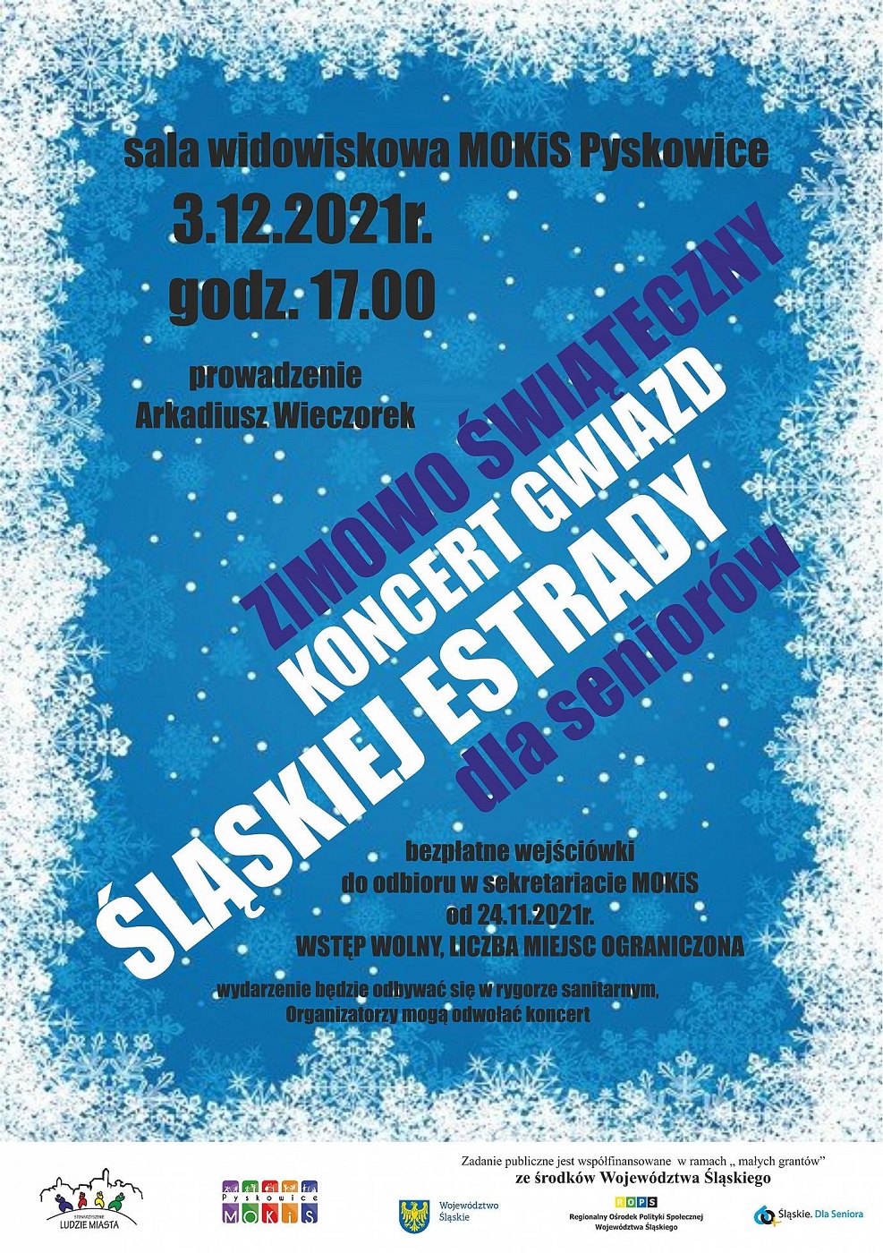 Miejski Ośrodek Kultury i Sportu w Pyskowicach razem ze Stowarzyszeniem Ludzie Miasta zaprasza seniorów na zimowo świąteczny koncert gwiazd estrady śląskiej. Koncert odbędzie się 3 grudnia br. o godz. 17.00 w sali widowiskowej Miejskiego Ośrodka Kultury i Sportu w Pyskowicach.