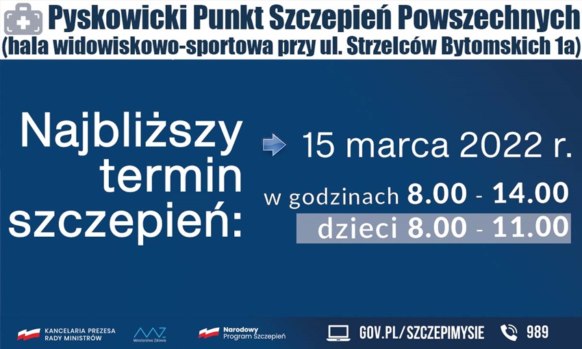 Ogólne informacje w sprawie szczepienia dzieci dostępne są na stronie www.gov.pl. PSP w Pyskowicach czynny będzie 15 marca od 8.00 do 14.00. W tym dniu szczepienia dzieci odbywać się będą w godzinach od 08.00 do 11.00. Uwaga! Nie są wymagane wcześniejsze zapisy.