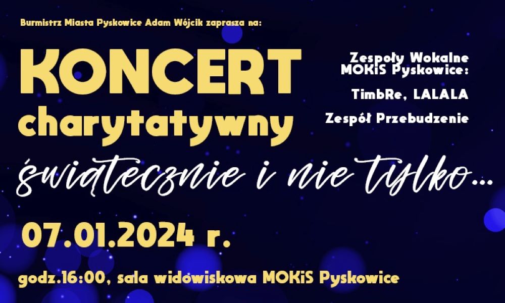Burmistrz miasta Pyskowice wraz z Zespołem Przebudzenie, grupami wokalnymi Miejskiego Ośrodka Kultury i Sportu oraz Stowarzyszeniem Ludzie Miasta zaprasza 7 stycznia na godz.16.00 na koncert charytatywny. Będzie świątecznie, ale nie tylko.