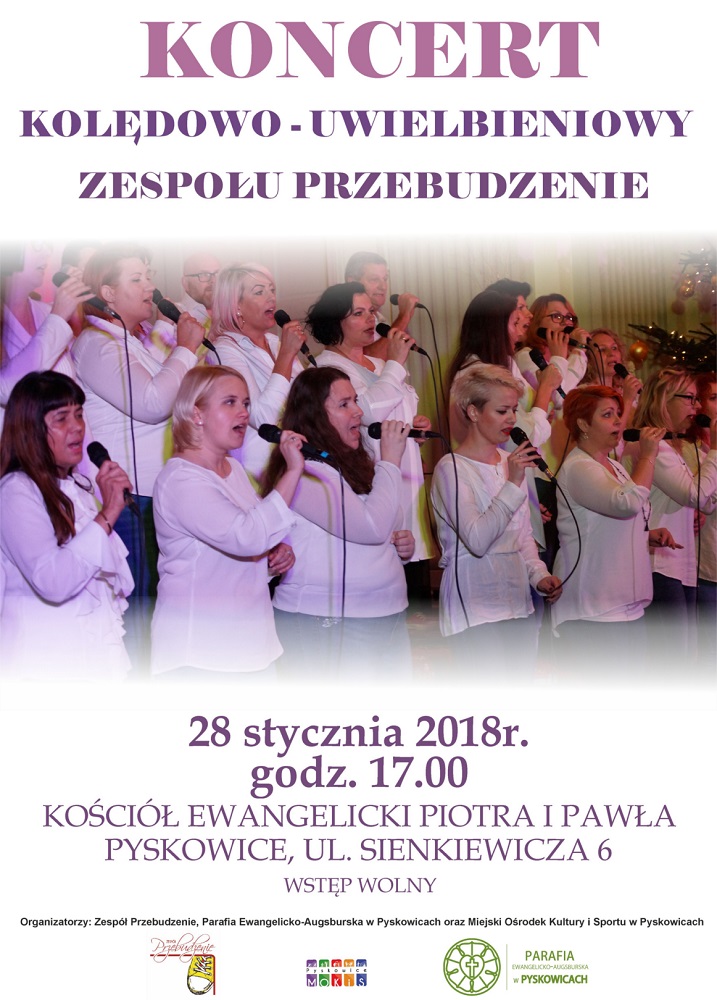 Organizatorzy: Zespół Przebudzenie, Parafia Ewangelicko-Augsburska w Pyskowicach oraz Miejski Ośrodek Kultury i Sportu w Pyskowicach