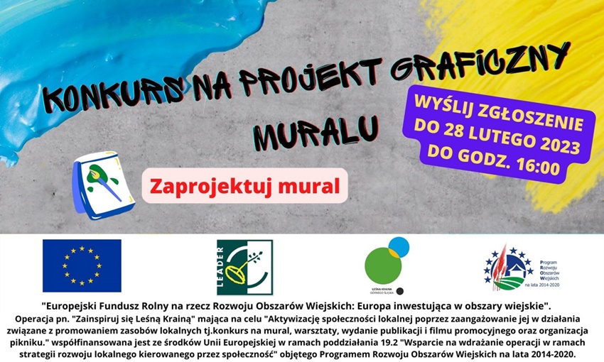 Stowarzyszenie Lokalna Grupa Działania “Leśna Kraina Górnego Śląska” zaprasza mieszkańców obszaru LGD z zamiłowaniem artystycznym do udziału w konkursie na projekt graficzny muralu, który powstanie we wskazanej przez laureata lokalizacji.