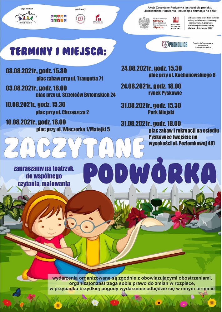 Zaczytane Podwórka są częścią projektu Roześmiane Podwórka – edukacja i animacja na polu przygotowanego przez Stowarzyszenie Ludzie Miasta. Przedsięwzięcie posiada dofinansowanie ze środków Ministra Kultury, Dziedzictwa Narodowego i Sportu w ramach programu Narodowego Centrum Kultury Kultura – Interwencje 2021 oraz ze środków gminy Pyskowice.