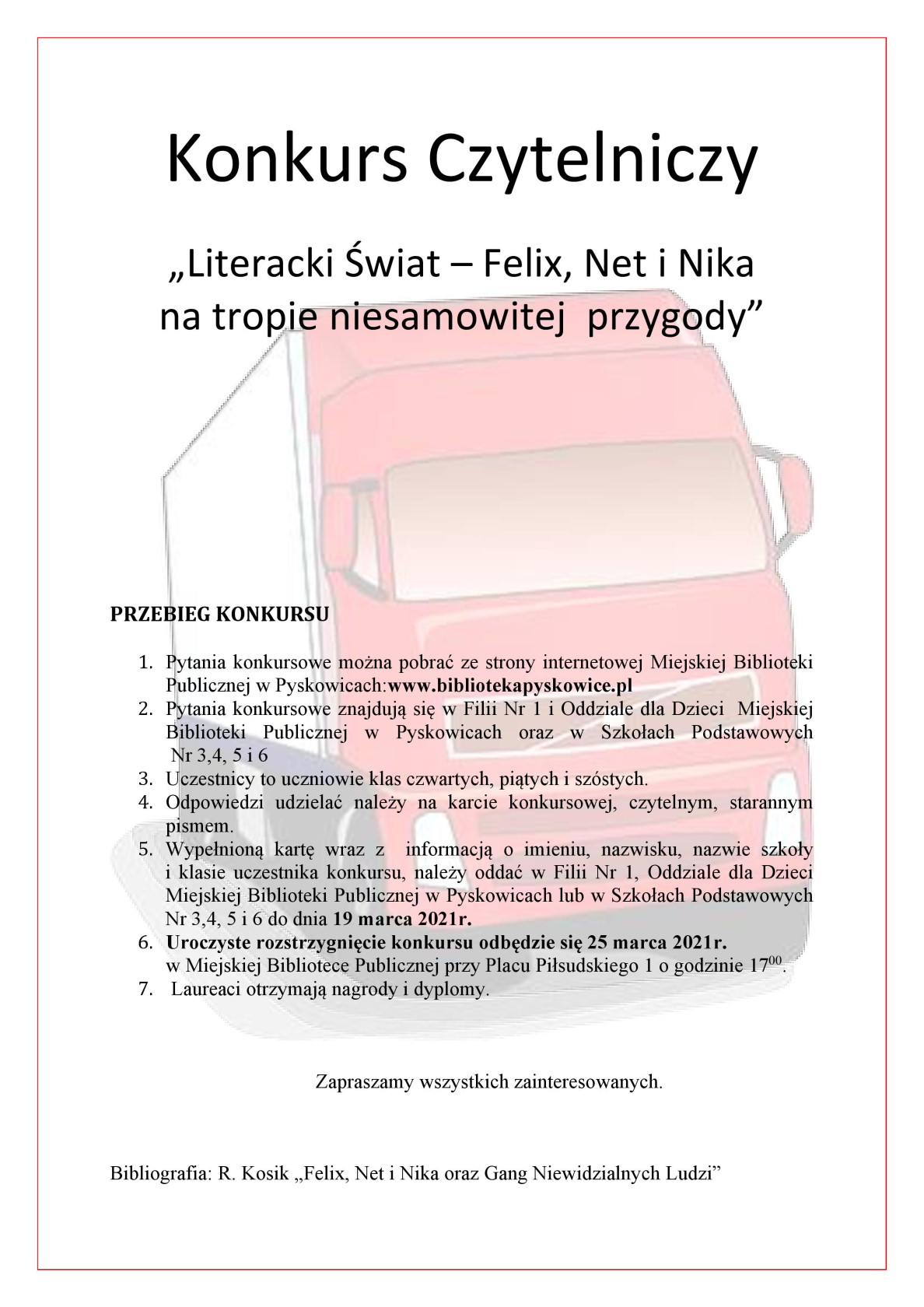 Miejska Biblioteka Publiczna w Pyskowicach ogłasza konkurs skierowany do uczniów klas od 4 do 6 szkoły podstawowej.