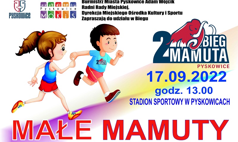 Razem z Miejskim Ośrodkiem Kultury i Sportu w Pyskowicach zaprasza się dzieci i młodzież do udziału w biegu Małe Mamuty. Zawody odbędą się 17 września, podobnie jak główne wydarzenie – II Pyskowicki Bieg Mamuta.