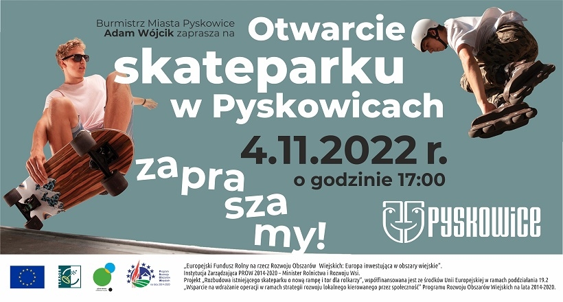 Burmistrz Pyskowic Adam Wójcik zaprasza 4 listopada na godz. 17.00 na uroczyste otwarcie nowego skateparku. Będą mistrzowskie pokazy jazdy na rolkach i desce, wspólny przejazd, pogadanka o bezpiecznym korzystaniu z obiektu. No i mnóstwo świetnej zabawy!
