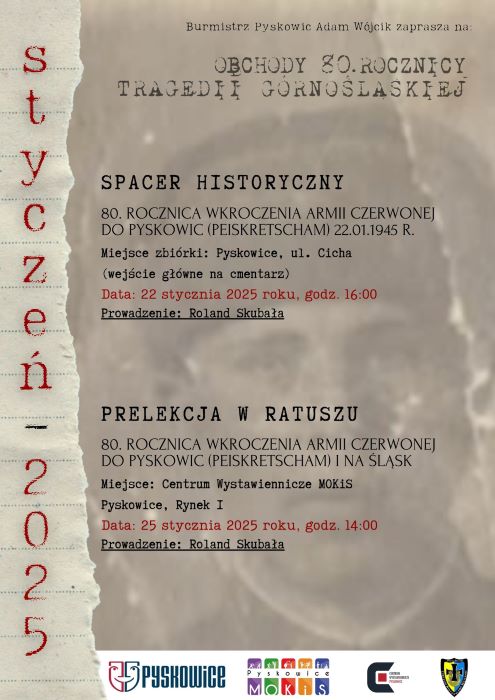 Organizatorzy zapraszają mieszkańców miasta i regionu na wyjątkowe wydarzenia upamiętniające 80. rocznicę Tragedii Górnośląskiej oraz wkroczenia Armii Czerwonej do Pyskowic w styczniu 1945 roku. Z tej okazji zaplanowano kilka wydarzeń.
