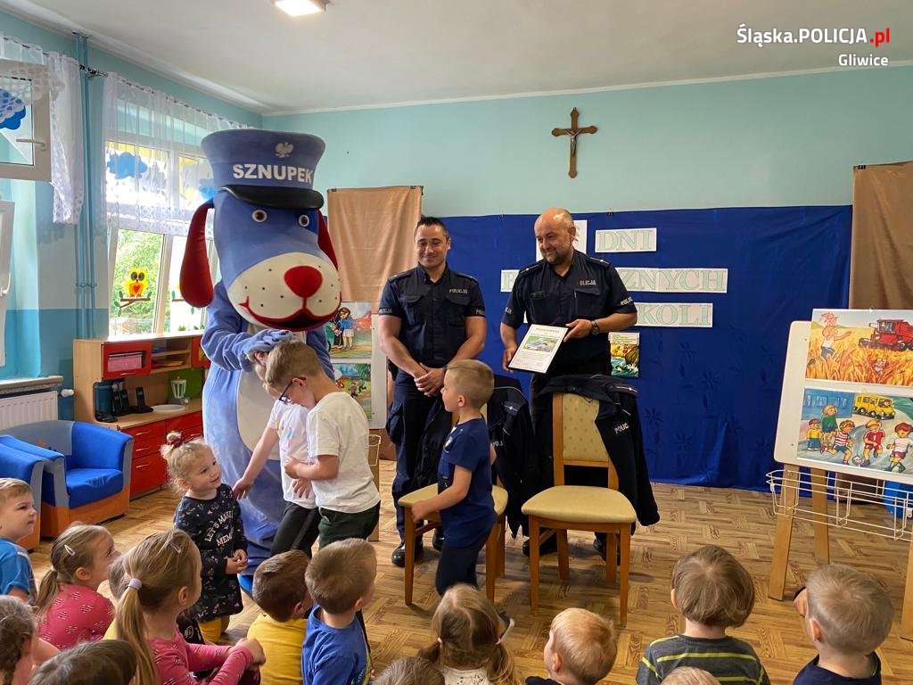 Na zdjęciach przykładowe spotkanie profilaktyczne. Dzielnicowi z miasta i gminy Toszek – aspiranci Jakub Szczepański oraz Adrian Gorel, którzy spotkali się z najmłodszymi w przedszkolu w Toszku. Mundurowi przywieźli ze sobą policyjną maskotkę – psa Sznupka.