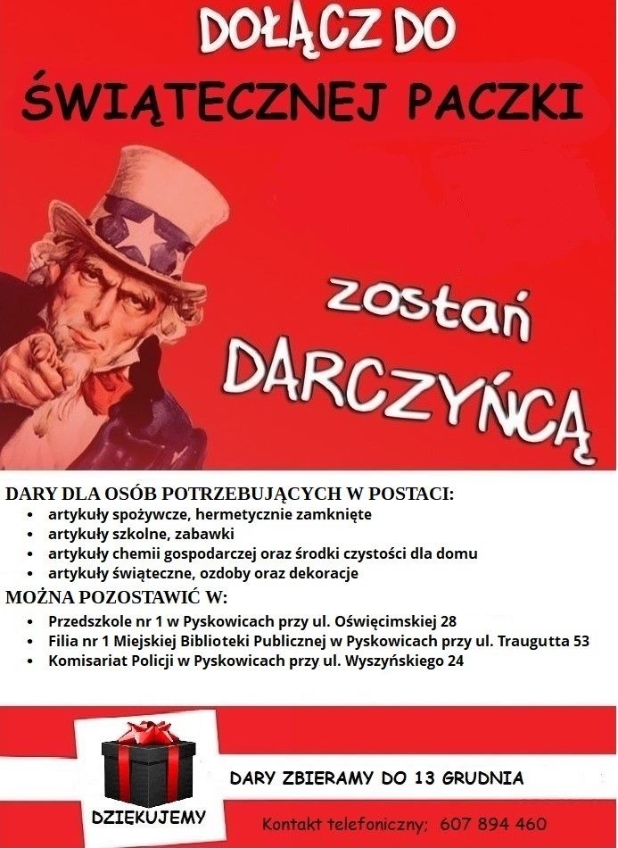 Policjanci z Pyskowic już od kilku lat uczestniczą w tej charytatywnej akcji. Osoby także chcące ją wesprzeć, mogą podzielić się z potrzebującymi, dostarczając wymienione wyżej rodzaje produktów do następujących punktów: