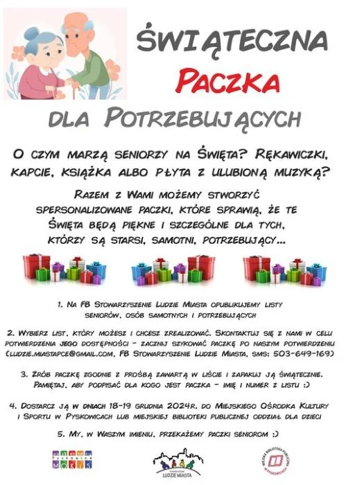 Wchodzimy powoli w czas, kiedy częściej i intensywniej myślimy o innych, zwłaszcza potrzebujących. Pyskowiczanie mają wielkie serca i chętnie pomagają. Kolejny już rok władze miasta zachęcają do wsparcia lokalnej inicjatywy od Stowarzyszenia Ludzie Miasta „Świąteczna paka dla potrzebujących”.