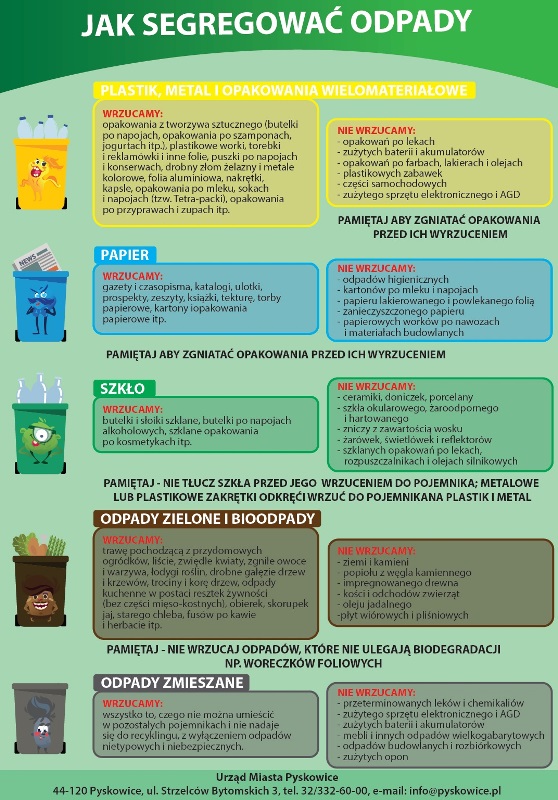 Firma realizująca zadanie polegające na odbiorze i zagospodarowaniu odpadów pochodzących z terenów Gminy Pyskowice realizuje sukcesywnie zadanie mające na celu przygotowanie gniazd śmietnikowych do prawidłowej segregacji. Naklejki, którymi oklejone zostały pojemniki w latach ubiegłych, na dzień dzisiejszy nie zawierają zmiany, która została wprowadzona od 1 stycznia. W związku z powyższym, do momentu ich aktualizacji proszę kierować się wytycznymi zawartymi w ulotkach dostarczonych do Państwa ze styczniowym wydaniem „Przeglądu Pyskowickiego”. ZOBACZ ULOTKĘ. Ponadto obowiązujące zasady segregacji dostępne są również w zakładce GOSPODARKA KOMUNALNA/ODPADY.