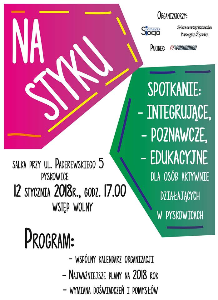 Stowarzyszenie Stacja Pyskowice zaprasza na spotkanie pn. "Na styku", wszystkie osoby już działające lub chcące zacząć działać na rzecz naszego miasta.Więcej informacji na plakacie poniżej:Tagi: Spotkanie