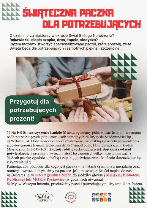 Stowarzyszenie Ludzie Miasta, przy wsparciu Miejskiej Biblioteki Publicznej w Pyskowicach i MOKiS Pyskowice, zaprasza mieszkańców do udziału w świątecznej akcji paczkowej. Celem jest przygotowanie spersonalizowanych paczek świątecznych dla seniorów, osób samotnych oraz osób w kryzysie bezdomności.