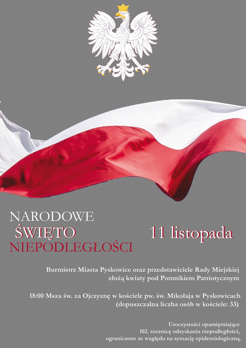 Zaplanowano złożenie kwiatów pod Pomnikiem Patriotycznym przez Burmistrza Miasta Pyskowice oraz przedstawicieli Rady Miejskiej. O godzinie 18.00 w kościele pw. św. Mikołaja rozpocznie się msza święta za Ojczyznę. Z powodów epidemiologicznych będzie mogło w niej uczestniczyć jedynie 33 wiernych.