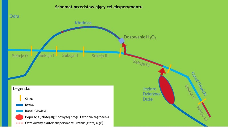 Eksperyment będzie polegał na dozowaniu nadtlenku wodoru (H2O2) do wód rzeki Kłodnica za małą elektrownią wodną Pławniowice. Jego celem jest wskazanie, czy środek ten skutecznie wpłynie na znaczne ograniczenie liczebności „złotej algi” w sytuacji jej dynamicznego zakwitu.