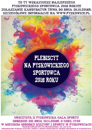 Zgłoszenia przyjmowane są do 26 października br., a nagrodzenie sportowców nastąpi podczas uroczystej II Pyskowickiej Gali Sportu, która odbędzie się dnia 30.11.2018r. o godz. 17:00 w Miejskim Ośrodku Kultury i Sportu przy ul. Kard. Stefana Wyszyńskiego 27 w Pyskowicach.