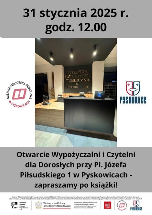 Od piątku 31 stycznia 2025 r., po półrocznej przerwie, będzie można znów korzystać z Wypożyczalni i Czytelni dla Dorosłych Miejskiej Biblioteki Publicznej w Pyskowicach.