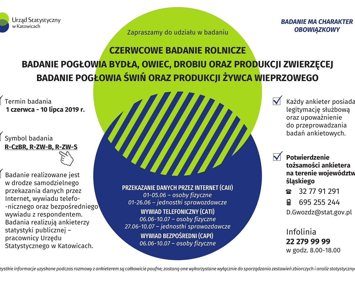 W dniach 1 czerwca - 10 lipca 2019 r. na terenie województwa śląskiego prowadzone będą badania ankietowe w rolnictwie: badanie pogłowia bydła, owiec, drobiu, badanie produkcji zwierzęcej oraz badanie pogłowia świń oraz produkcji żywca wieprzowego.