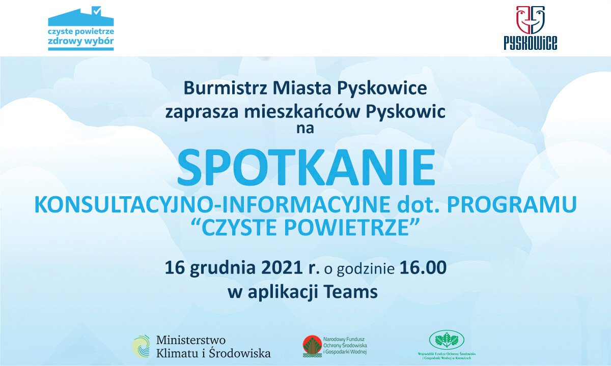 Adam Wójcik, Burmistrz Miasta Pyskowice, zaprasza 16 grudnia o godzinie 16.00 na spotkanie konsultacyjno-informacyjne w sprawie programu “Czyste Powietrze”. Na pytania mieszkańców odpowiedzą urzędnicy i eksperci związani z programem. W związku z sytuacją epidemiczną spotkanie odbędzie się online, poprzez aplikację Microsoft Teams.