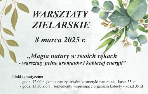 W Pyskowicach z okazji 8 marca przygotowano coś specjalnego dla wszystkich miłośniczek natury! Organizatorzy zapraszają na warsztaty zielarskie „Magia natury w Twoich rękach”, które wprowadzą uczestniczki w świat roślin, ich właściwości oraz zastosowania w codziennym życiu. To idealna okazja, by nauczyć się tworzyć naturalne preparaty, które będą wspierały zdrowie, urodę i dobre samopoczucie.