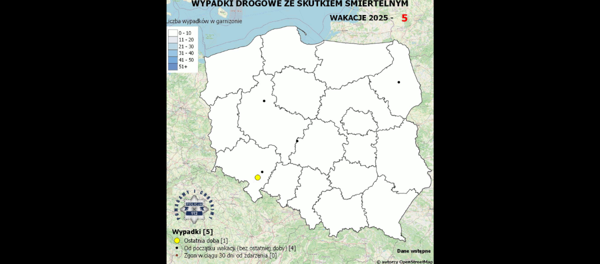 Wraz z początkiem wakacji 2025 Policja już po raz siódmy uruchomiła specjalny projekt pn. „Wypadki drogowe ze skutkiem śmiertelnym – Wakacje 2025”. To interaktywna mapa Polski, która codziennie prezentuje informacje o wypadkach zakończonych śmiercią uczestników ruchu drogowego. Celem akcji jest zwrócenie uwagi na realne skutki łamania przepisów drogowych i zachęcenie do bezpiecznego podróżowania.