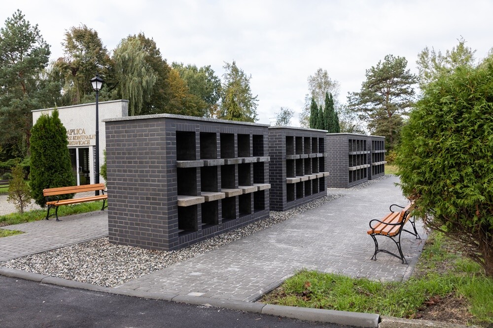 Kolumbarium usytuowane zostało w sąsiedztwie kaplicy cmentarnej, prostopadle do istniejącej alei. Wokół pojawiły się obrzeża i chodniki z kostki betonowej oraz osiem żeliwnych ławek z drewnianymi siedziskami.
