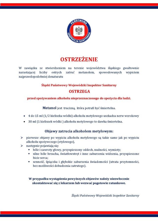 Na terenie województwa śląskiego stwierdzono w ostatnim czasie wiele przypadków zatruć metanolem.