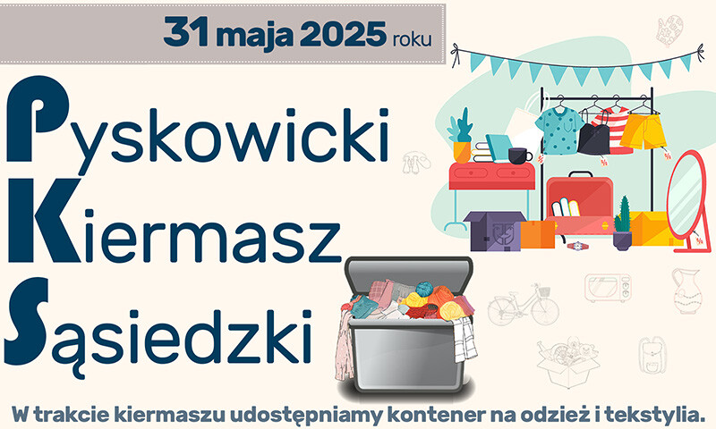 Władze miasta zapraszają na kolejną odsłonę Pyskowickiego Kiermaszu Sąsiedzkiego. Kiermasz odbędzie się w sobotę 31 maja w godz. 8:00 – 15:00. PKS w Pyskowicach to idealna okazja, by sprzedać niepotrzebne rzeczy i dać im drugie życie. Opłata targowa wynosi tylko 7 zł, a na miejscu prowadzona będzie także zbiórka odzieży.