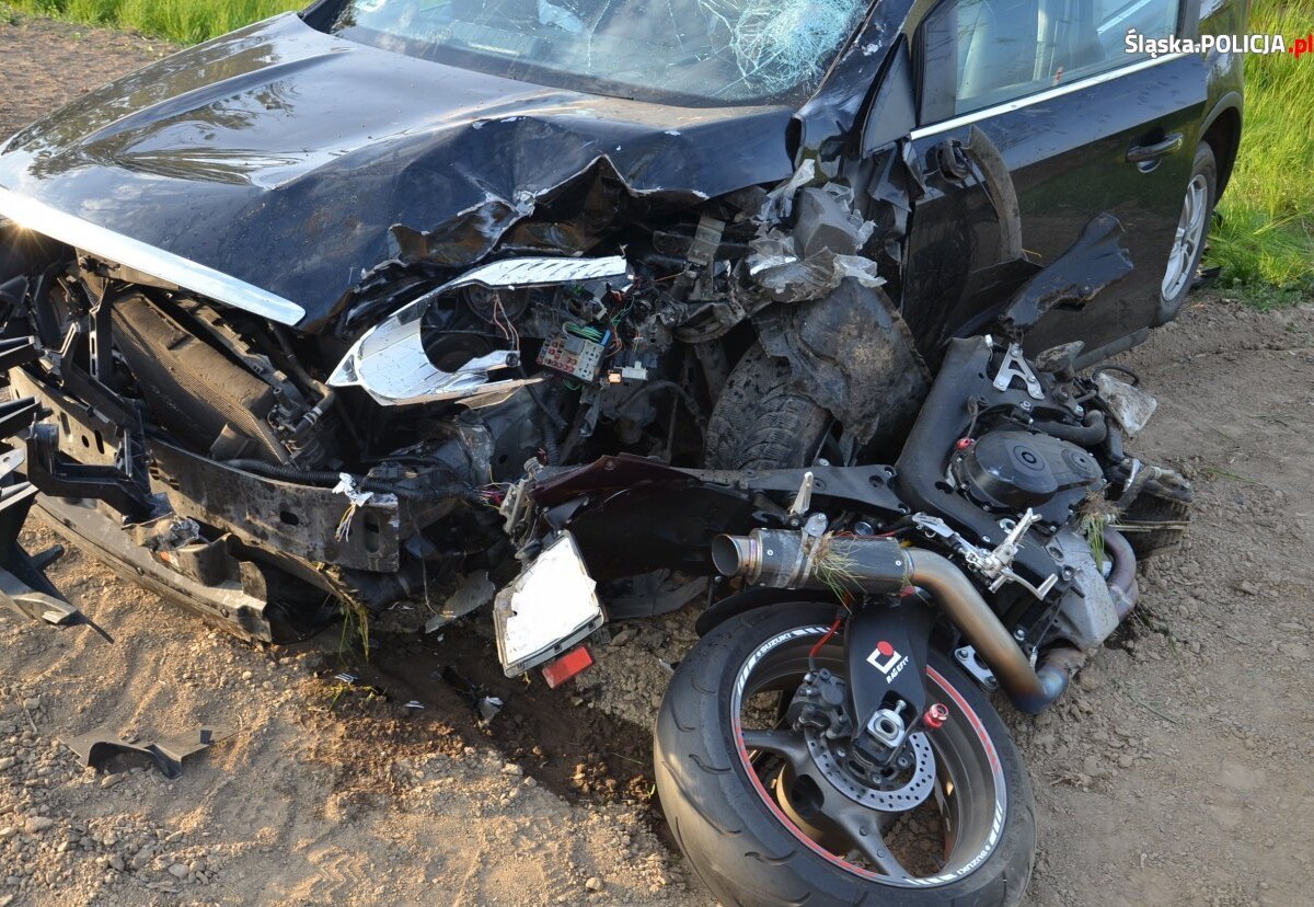 Miejsce zdarzenia - motocykl po zderzeniu z osobówką