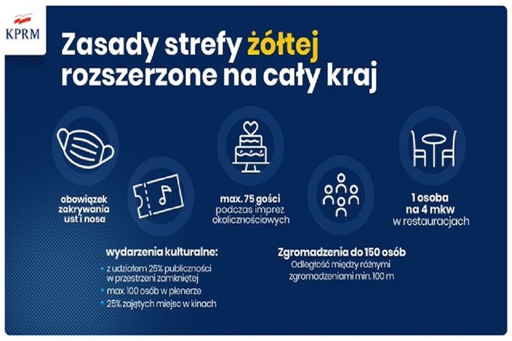 W całym kraju, tak jak dotychczas w strefie żółtej obowiązywać będzie m.in. limit jednej osoby na 4 m kw. w przypadku imprez takich jak: targi, wystawy, kongresy czy konferencje. W siłowniach jest limit osób – jedna na 7 m kw. W kinach może być 25 proc. publiczności. Liczba osób biorących udział w imprezach rodzinnych nie może przekroczyć 100 osób, z wyłączeniem obsługi. Ale już 17 października wejdą w życie nowe ograniczenia dotyczące imprez okolicznościowych: w strefie czerwonej – 50 osób, na pozostałym obszarze 75.