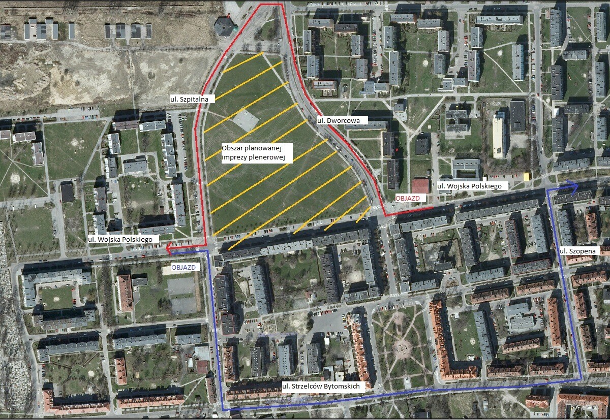 - dla pojazdów przemieszczających się w kierunku wschodnim ul. Wojska Polskiego, objazd nastąpi ul. Szpitalną w kierunku południowym, ul. Strzelców Bytomskich, ul. Szopena;