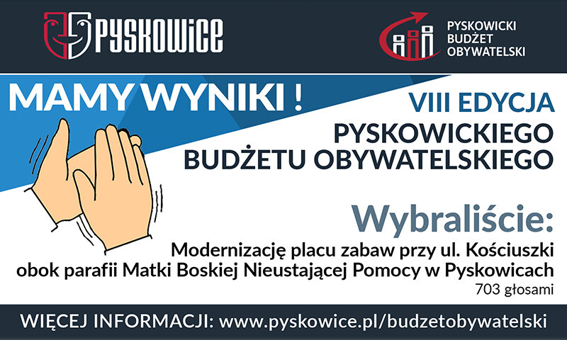 W VIII edycji Pyskowickiego Budżetu Obywatelskiego największą ilość głosów zgromadziła "Modernizacja placu zabaw przy ul. Kościuszki obok parafii Matki Boskiej Nieustającej Pomocy". Projekt ten uzyskał poparcie aż 703 mieszkańców Pyskowic i zostanie zrealizowany w przyszłym roku.