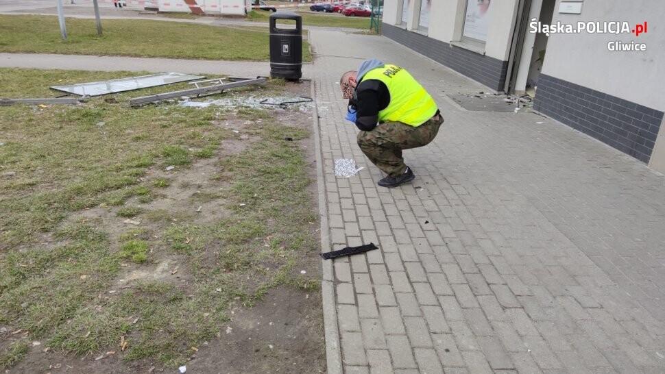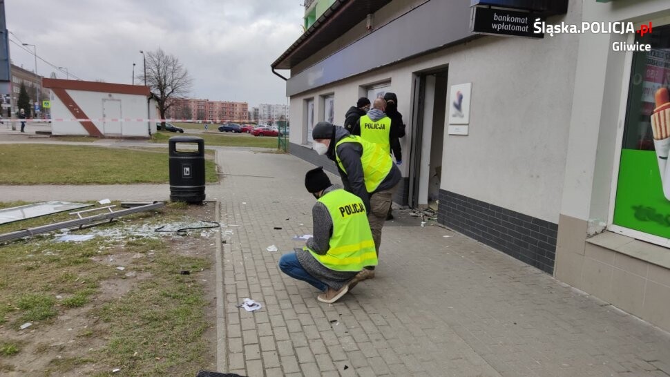 Śledczy z wydziału ds. zwalczania przestępczości przeciwko mieniu wszczęli postępowanie w sprawie kradzieży z włamaniem do bankomatu w Pyskowicach. Wybuch zniszczył dwie stojące obok siebie maszyny, spowodował również duże uszkodzenia i straty w mieniu wolno stojącego budynku banku. Trwa ustalanie sumy skradzionej gotówki.
