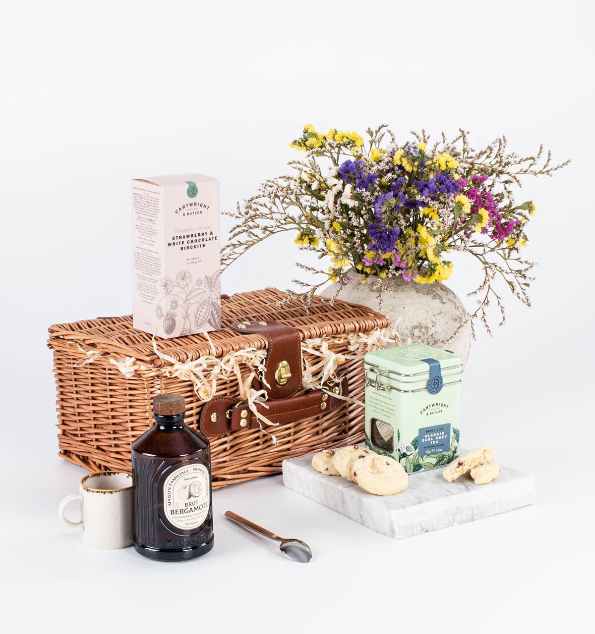 Kosz upominkowy z herbatą, kubkiem i ciasteczkami